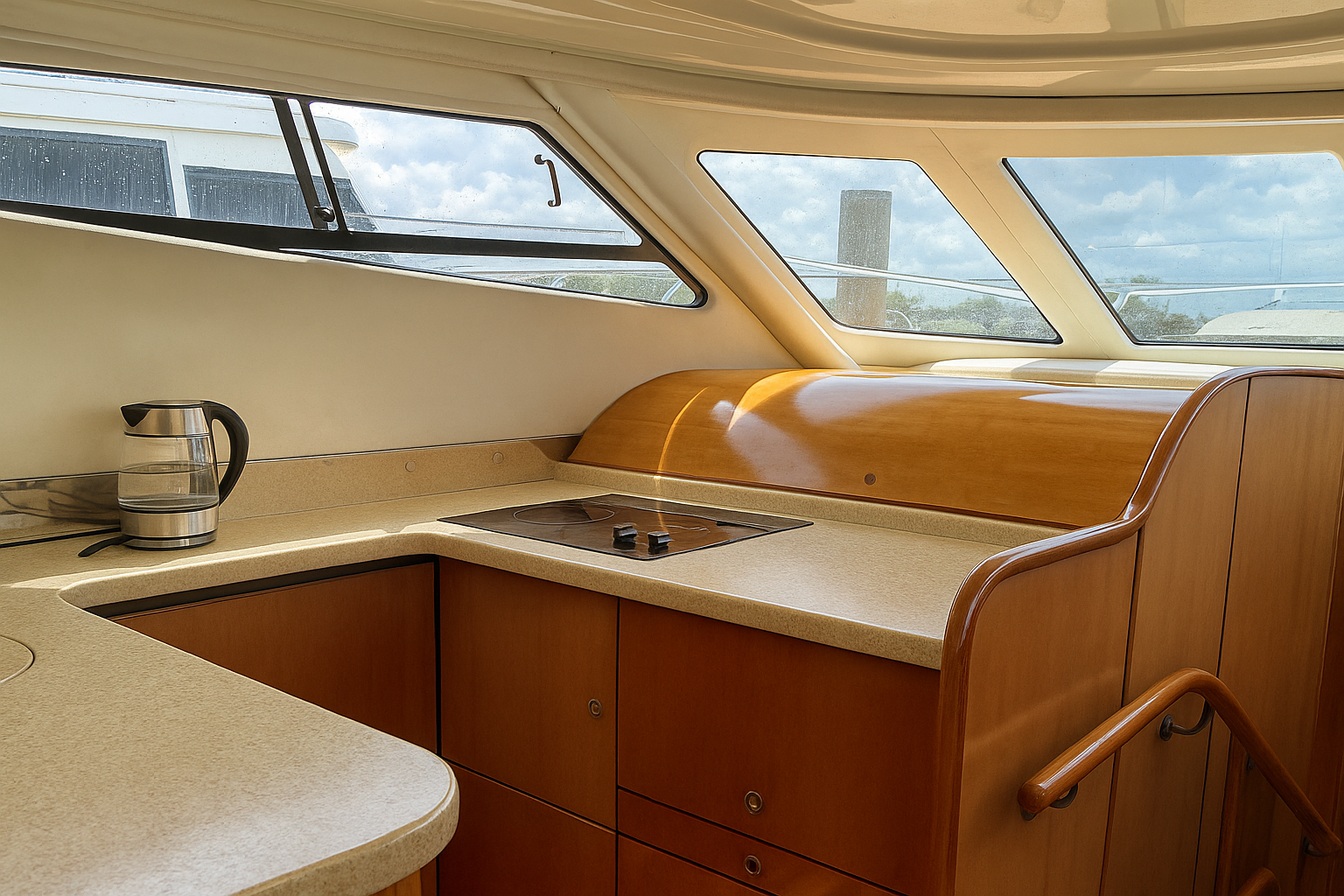 Spacious Interior: 3 cabins, 2 full bathrooms, a fully equipped galley, and air-conditioned lounge areas.